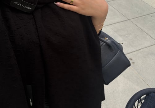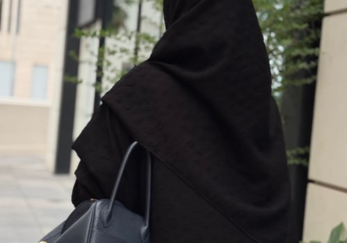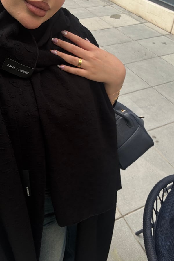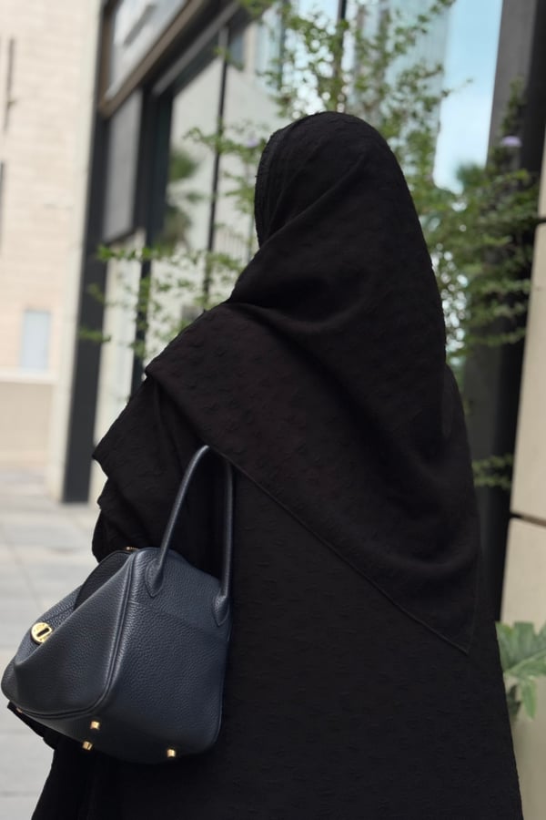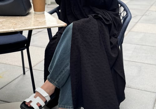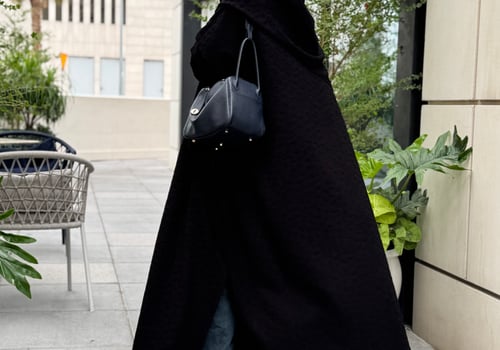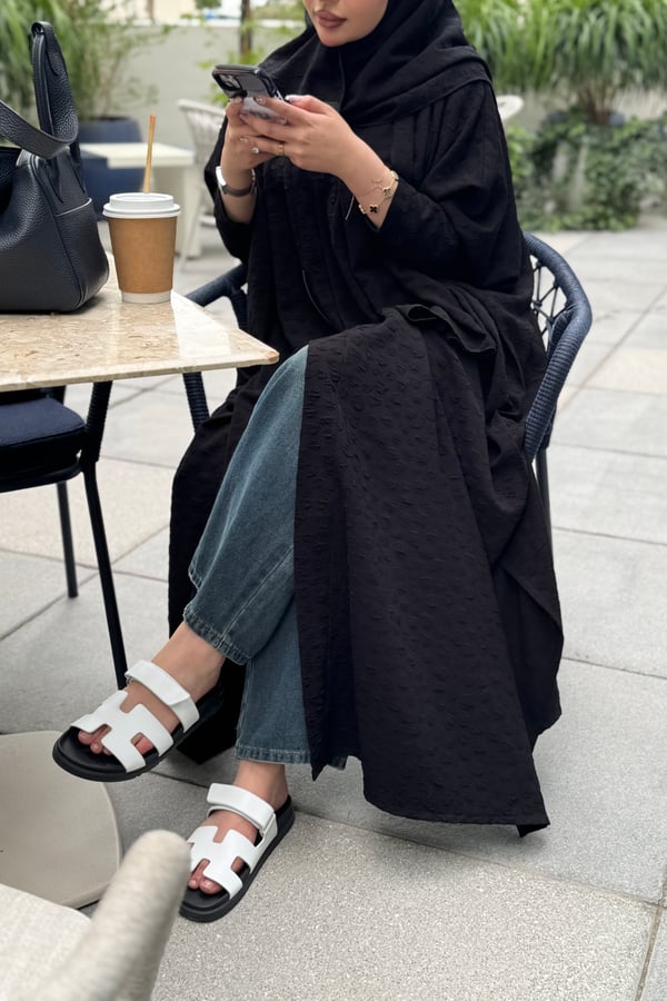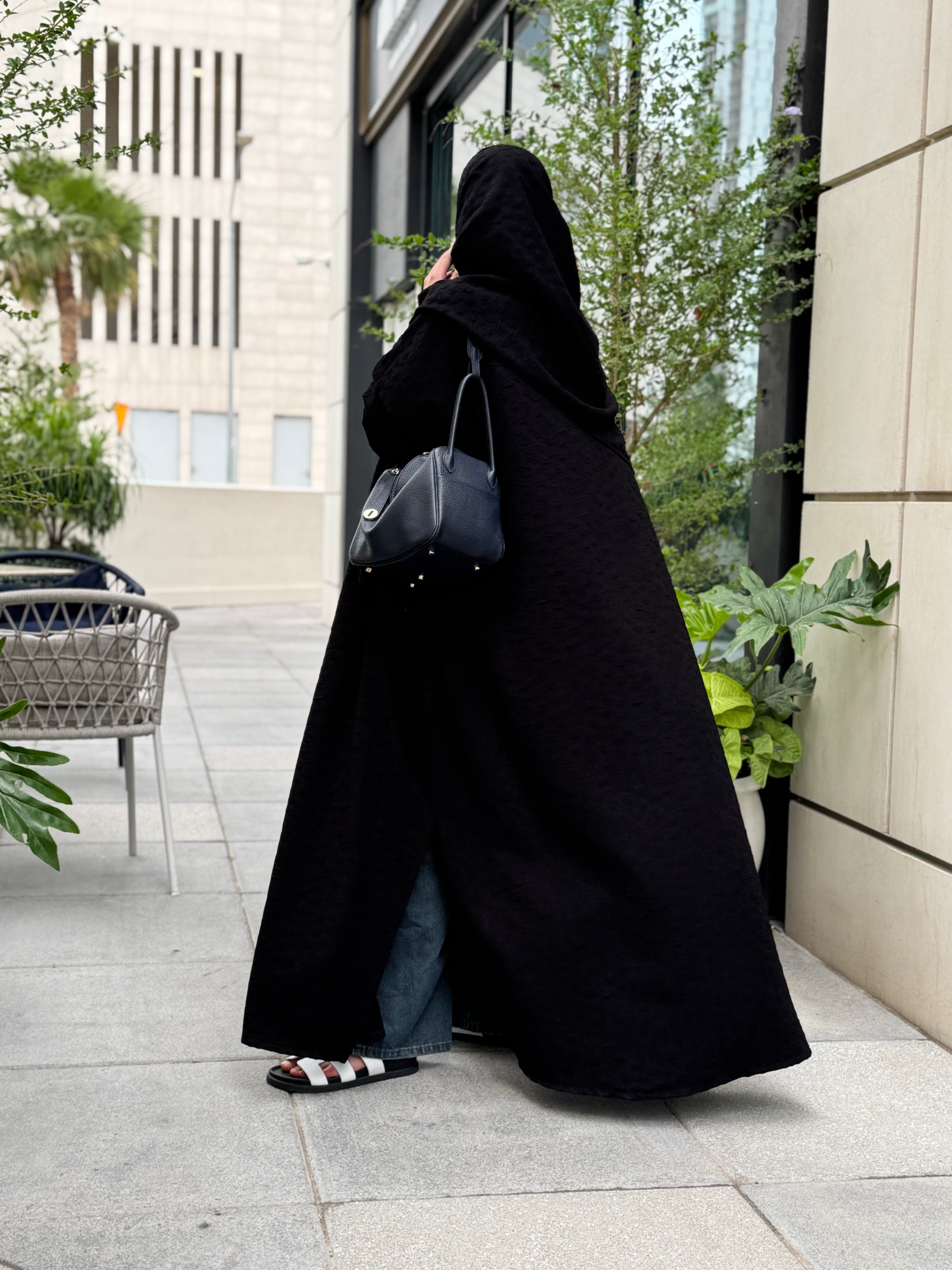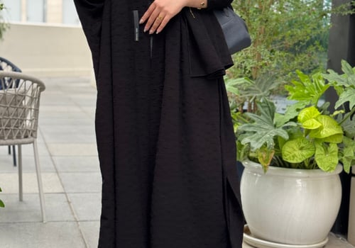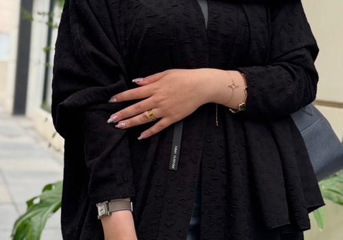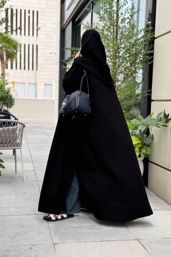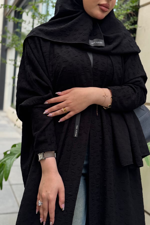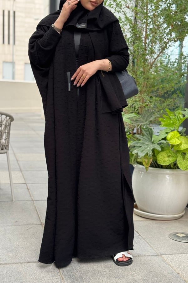 An abaya made of jacquard crepe fabric with a matching head covering made of the same fabric, featuring a bisht design and side slits.