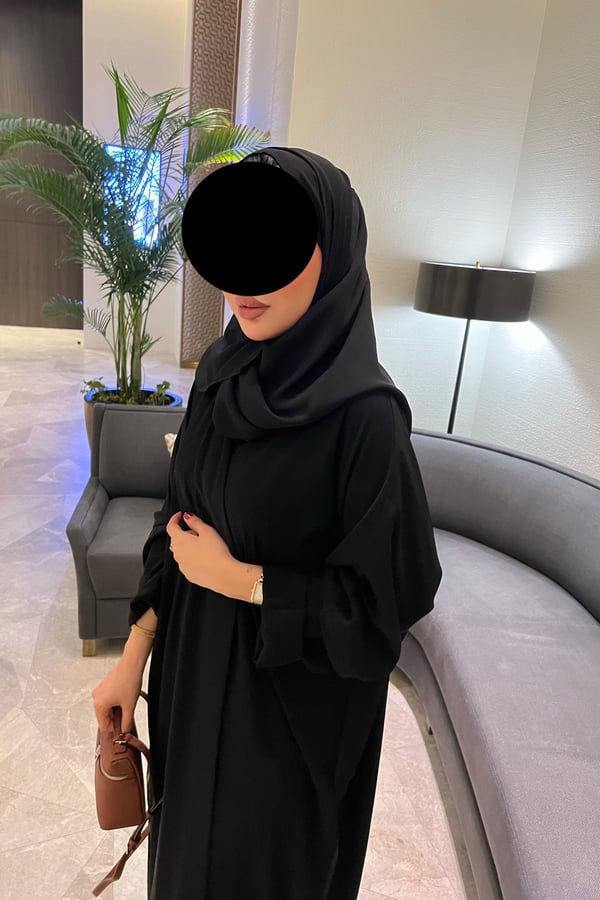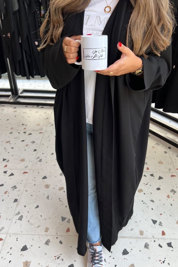 A kimono-style abaya with side slits, ma...