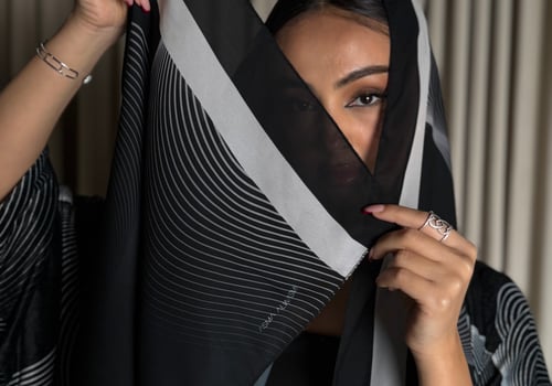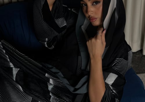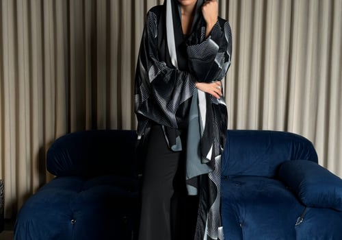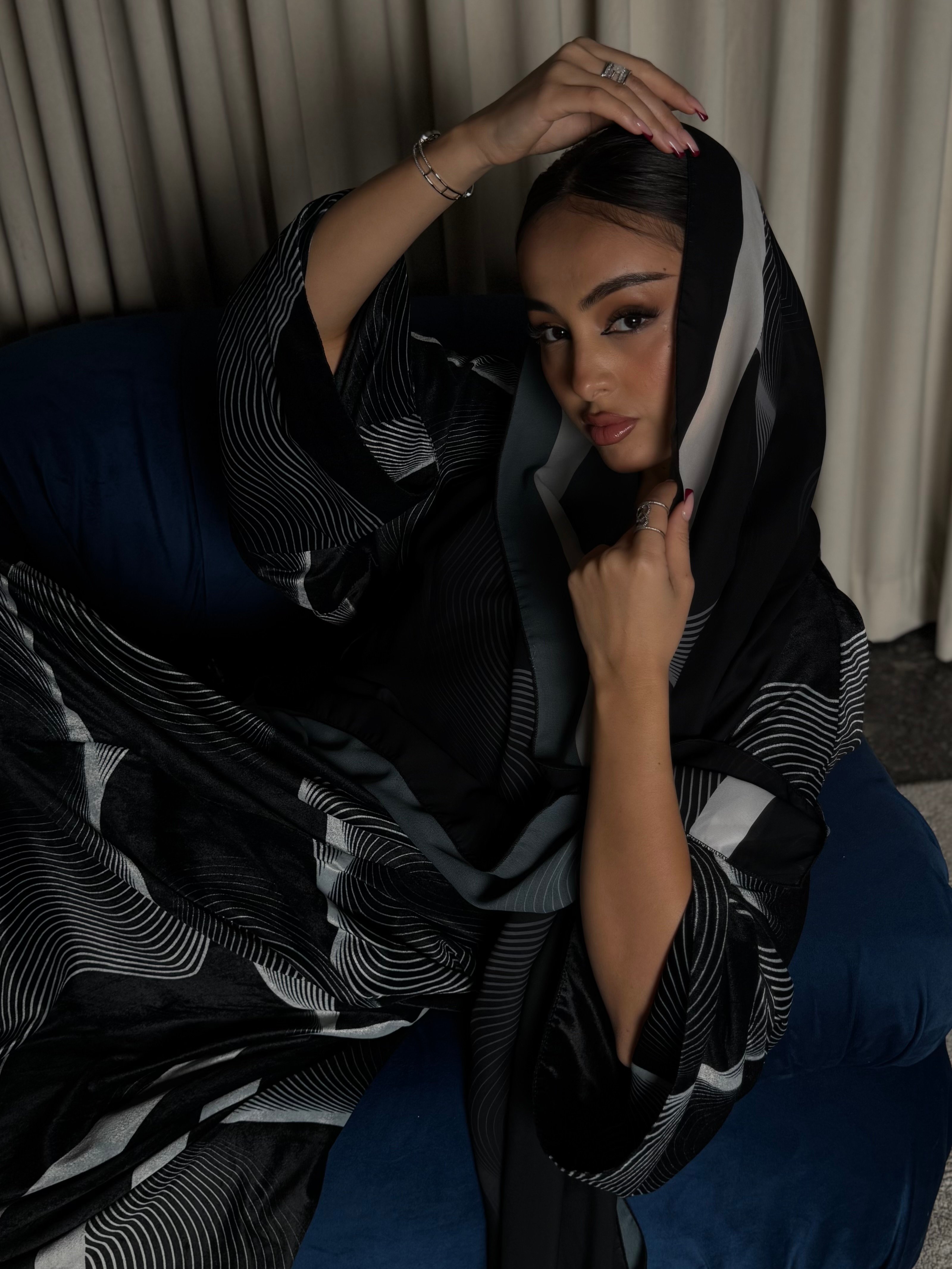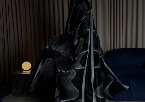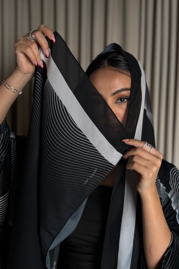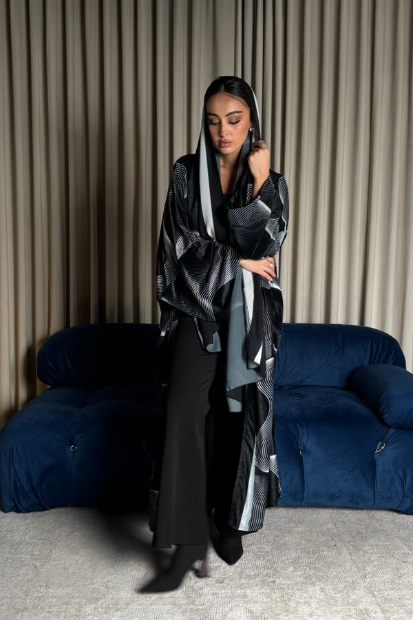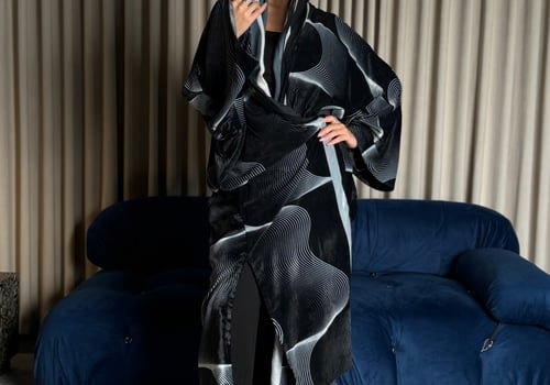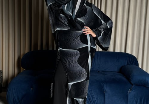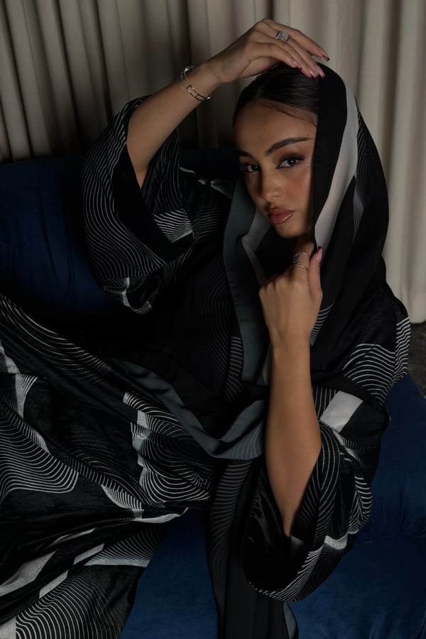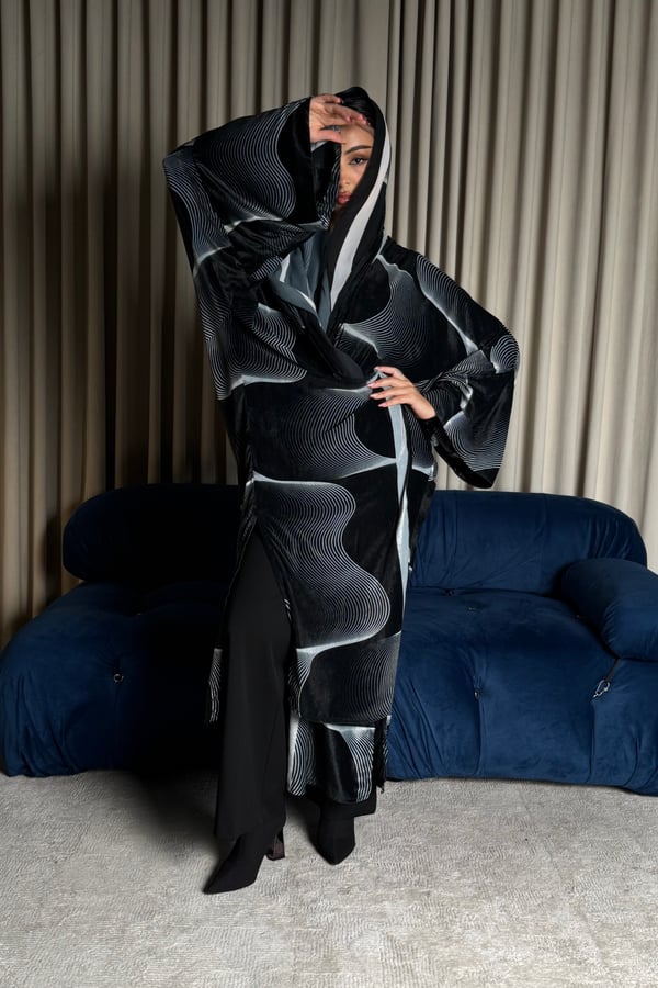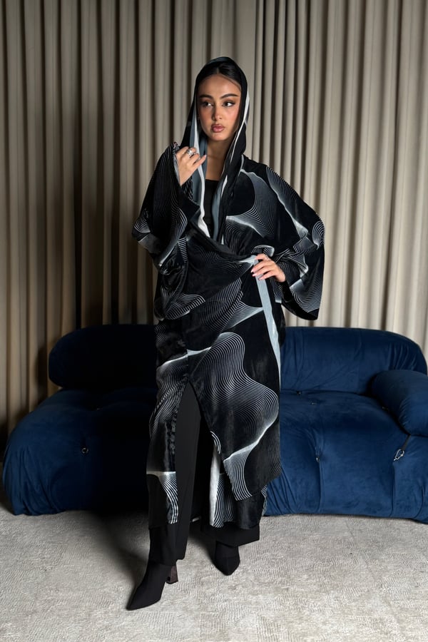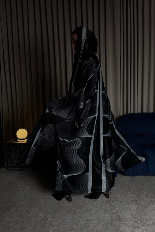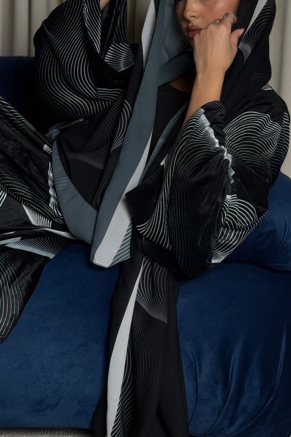 A velvet abaya with a distinctive pattern, specially designed for Asma Al Wasmi. The abaya and headscarf both feature the Asma Al Wasmi logo. The abaya has a kimono-inspired cut with side slits and comes with a matching headscarf with a unique design.