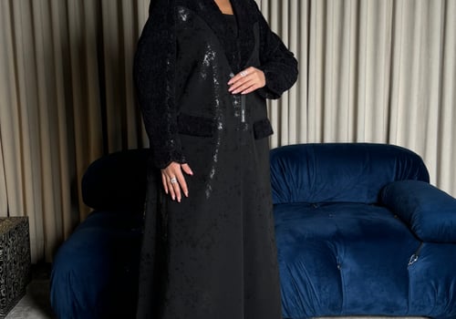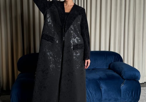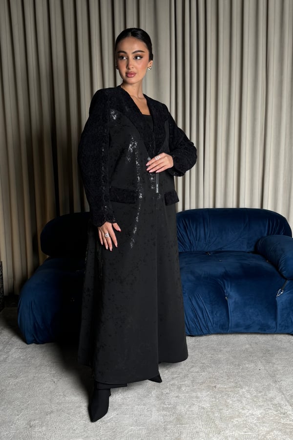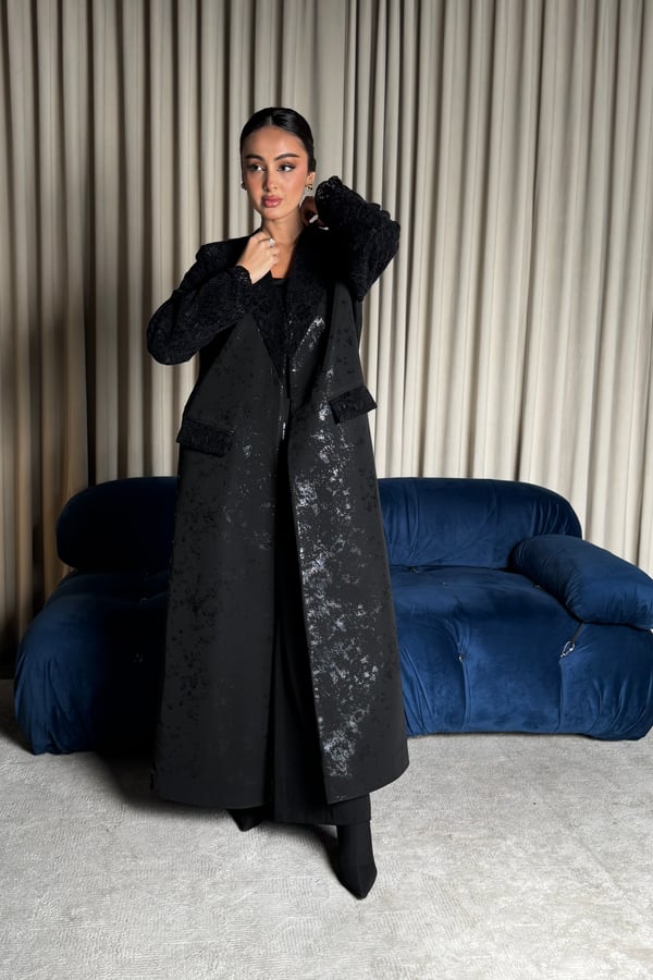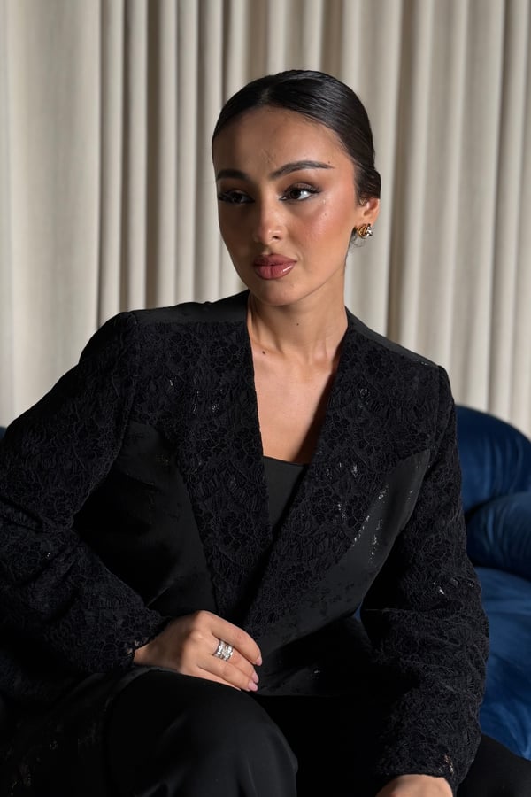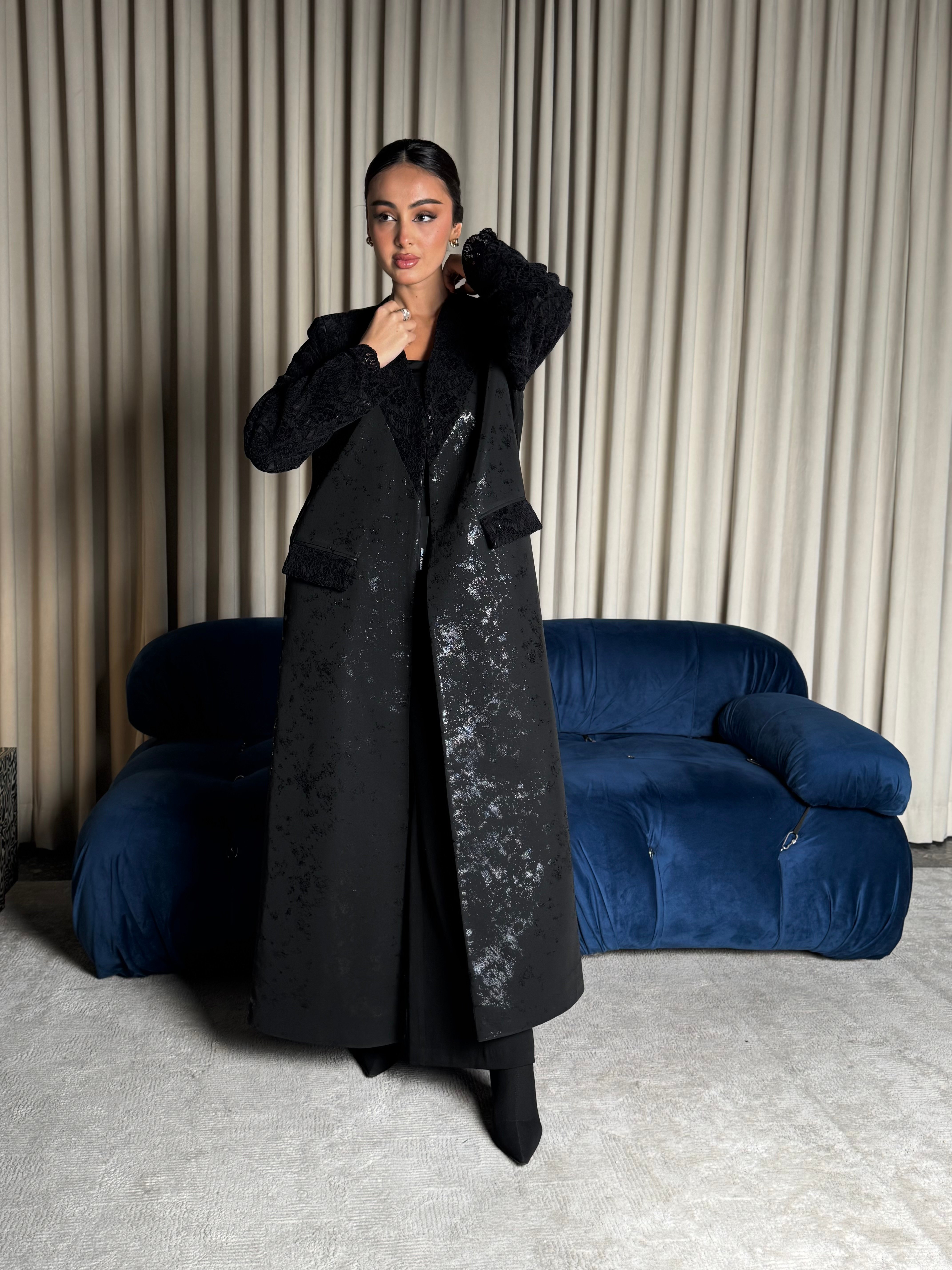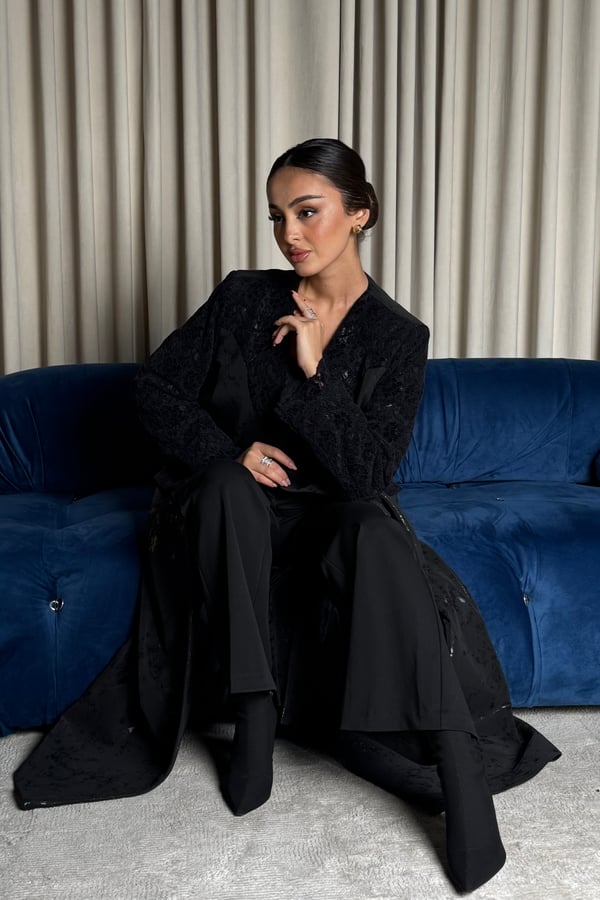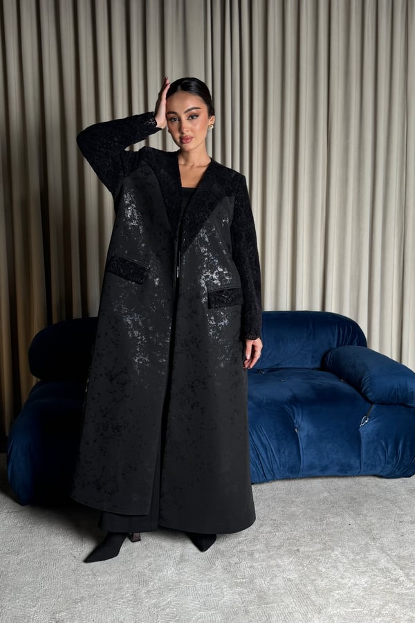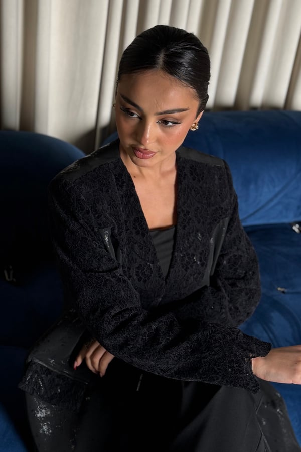 A classic blazer in subtle patterned patent leather with velvet lace sleeves, featuring a straight, flowing cut and front pockets adorned with velvet lace trim. No scarf included.