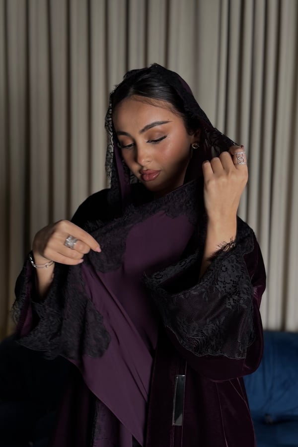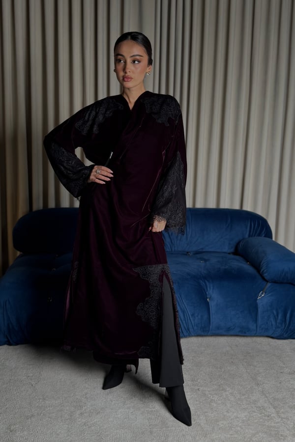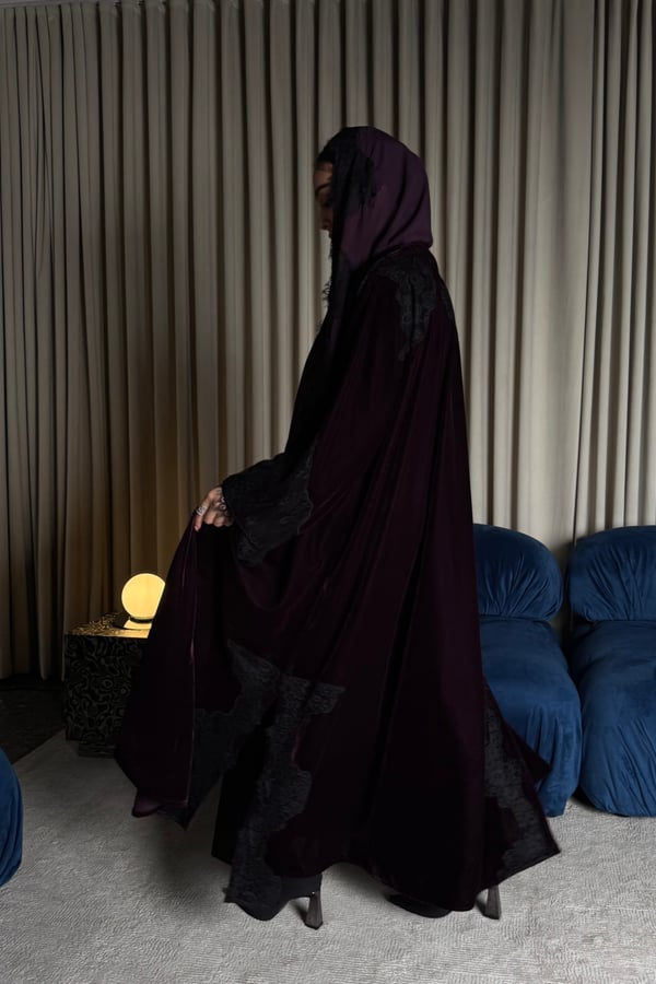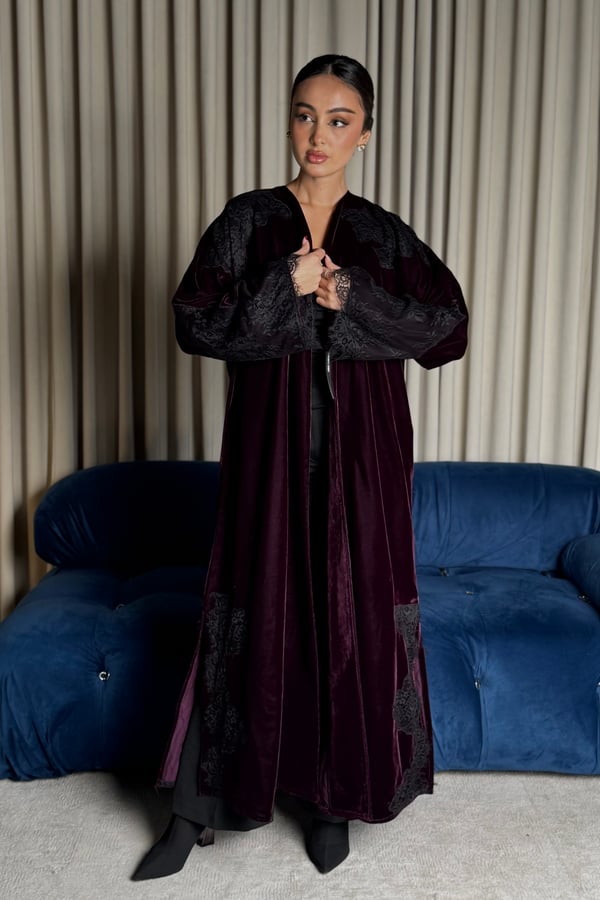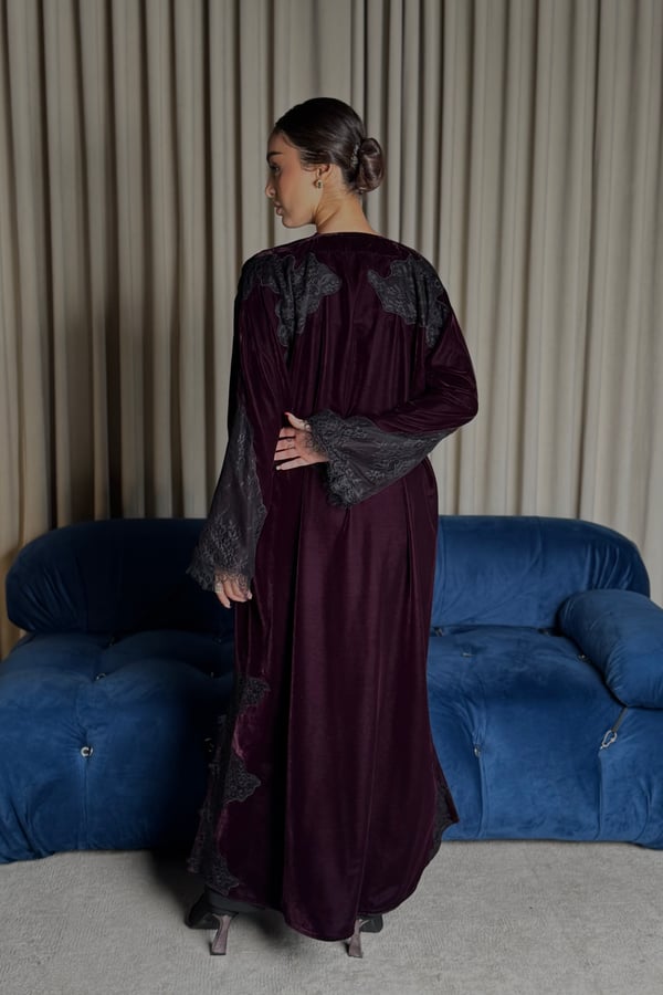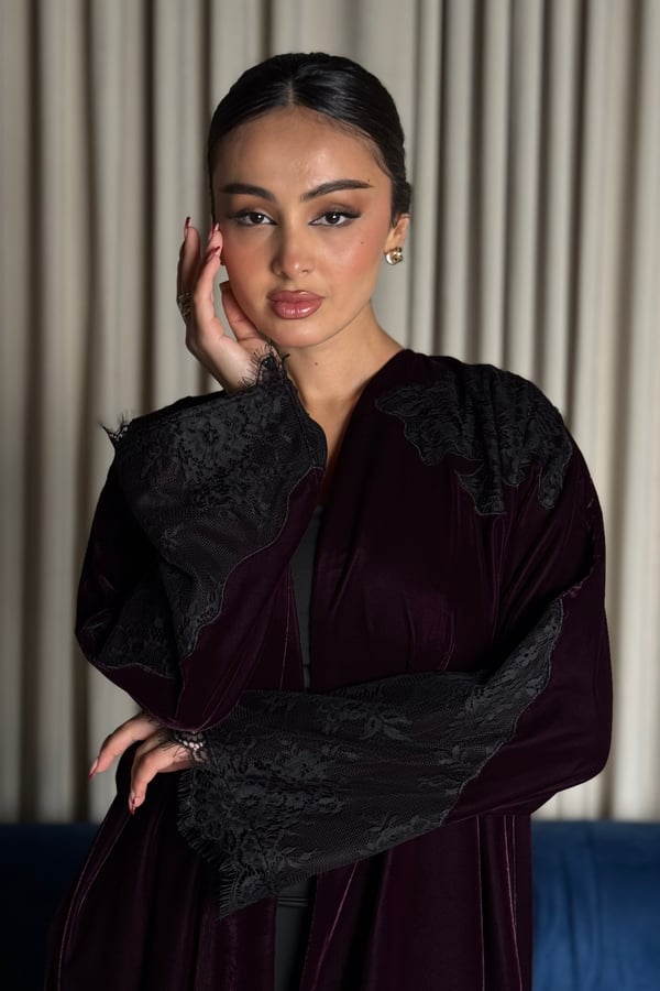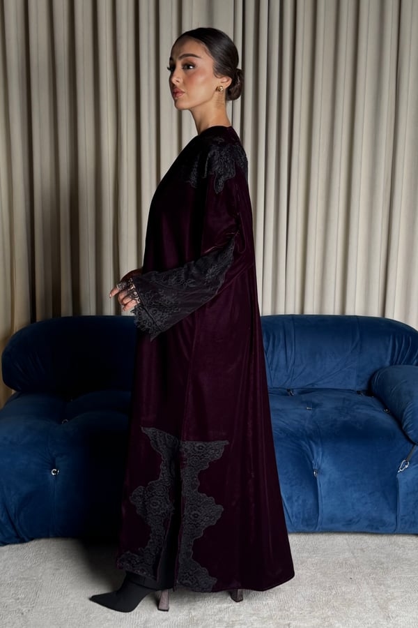 A burgundy Korean velvet abaya with a T-neck, featuring embellished quilted lace embroidery on the shoulder and lace-trimmed side slits. It comes with a matching lace head covering.