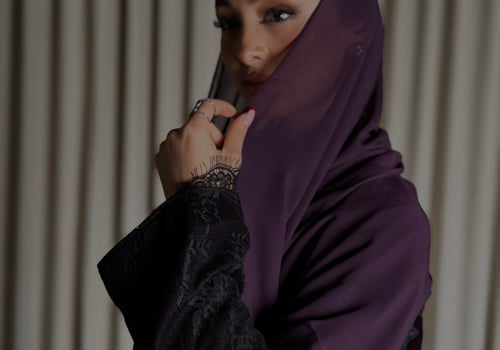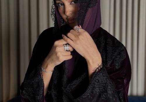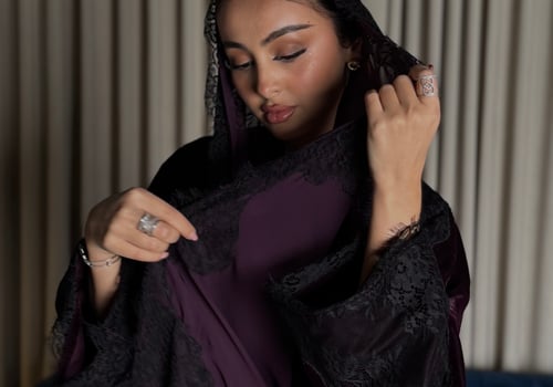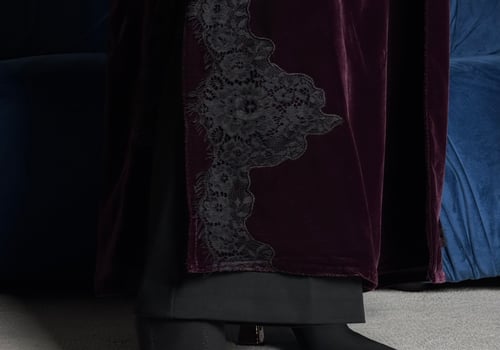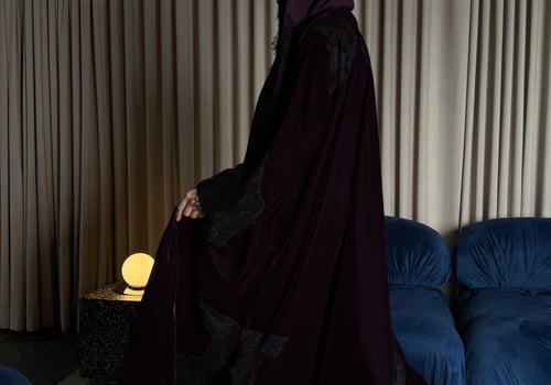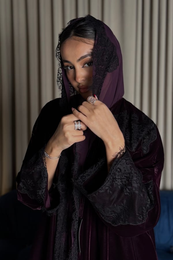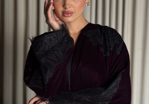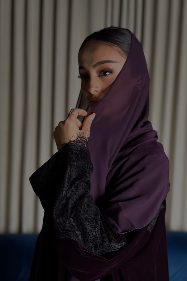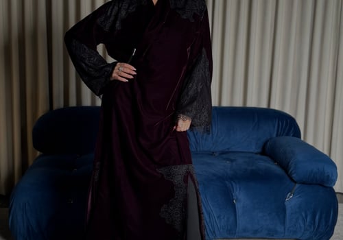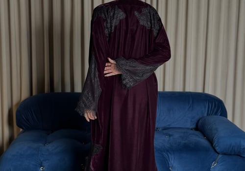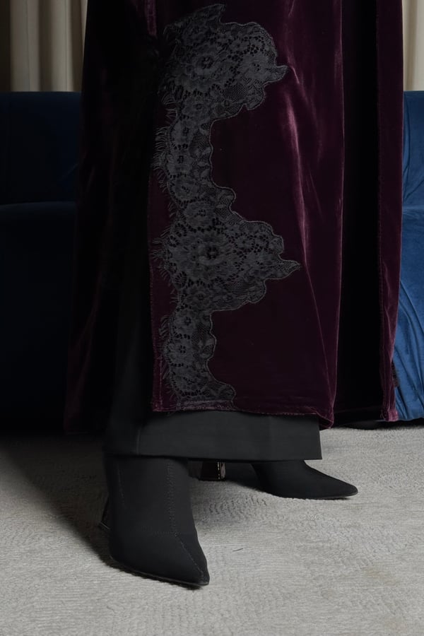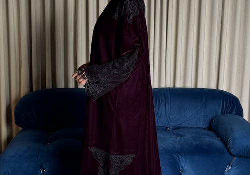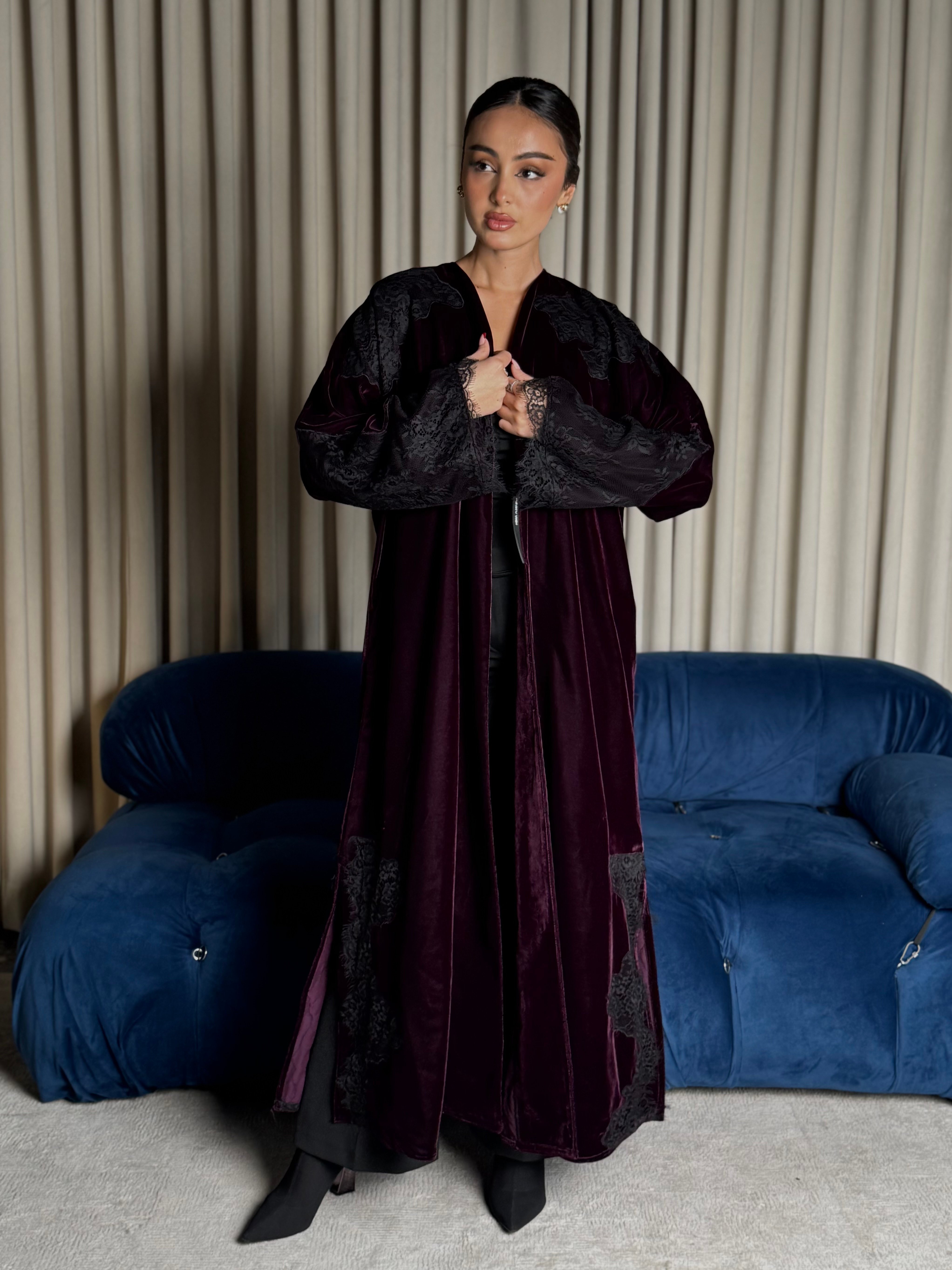 A burgundy Korean velvet abaya with a T-neck, featuring embellished quilted lace embroidery on the shoulder and lace-trimmed side slits. It comes with a matching lace head covering.